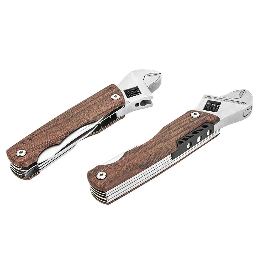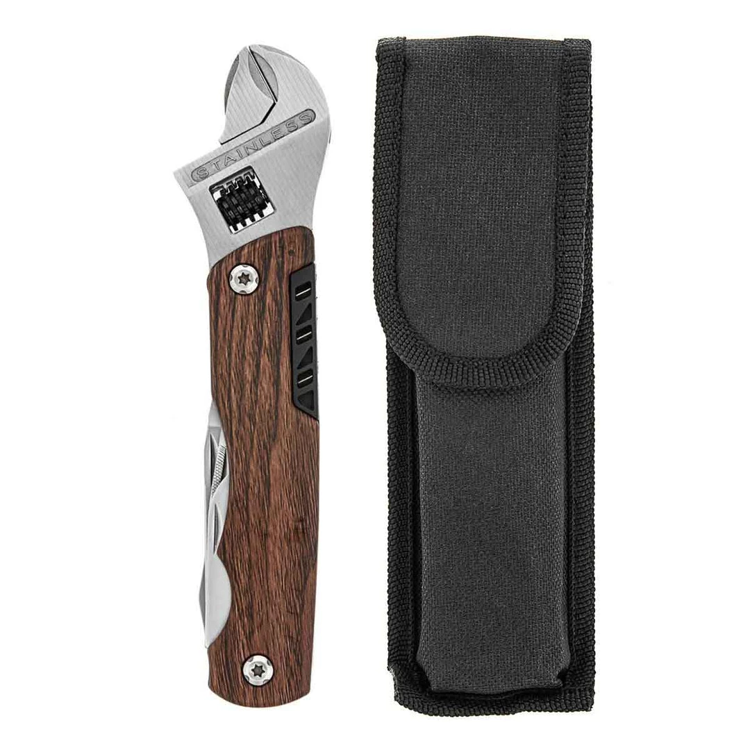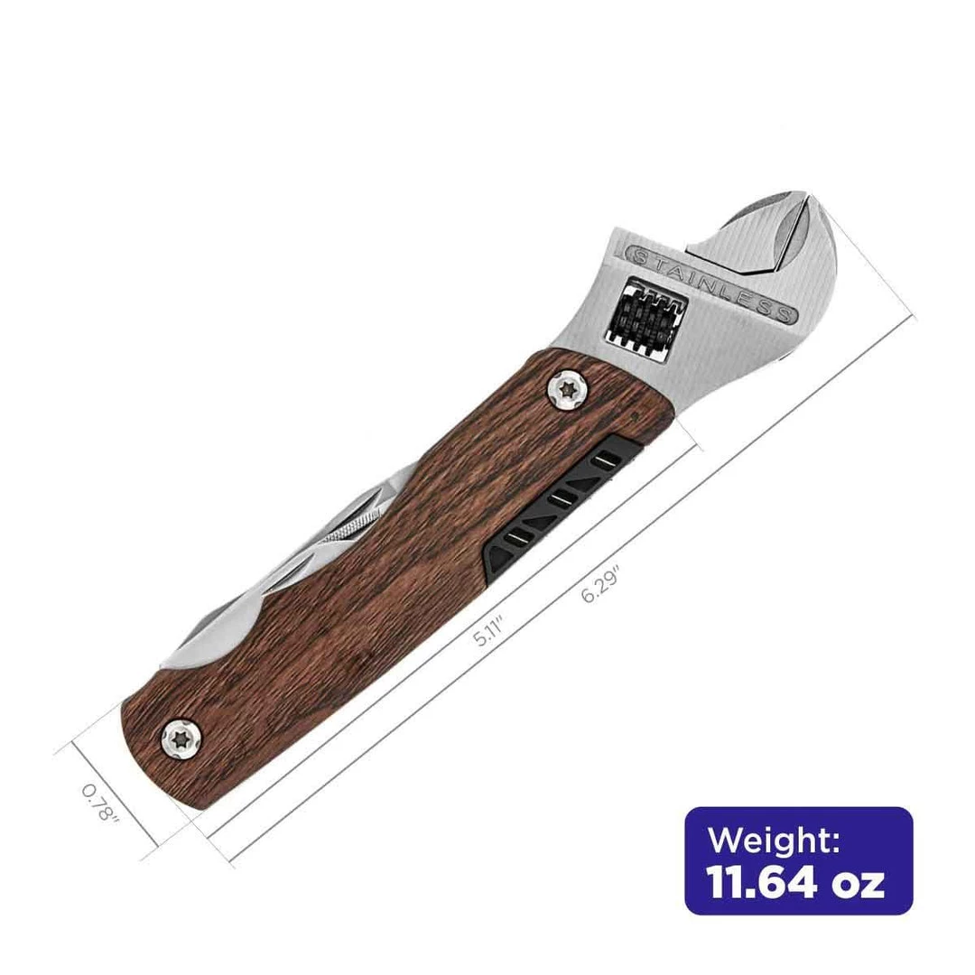 - MULTIFUNCTIONAL MULTITOOL: This 8-in-1 multitool has a lot of necessary tools: adjustable wrench, three screwdriver bits, knife, can and bottle opener, file, nut wrenches, flat screwdriver, and pry tool.
