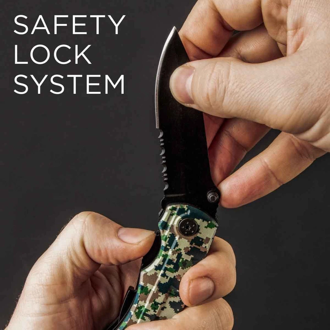 - SAFE: The multitool features the locking button, which guarantees safety and locks the blades when they are deployed. To fold the blades, just push the button. This design ensures safety.