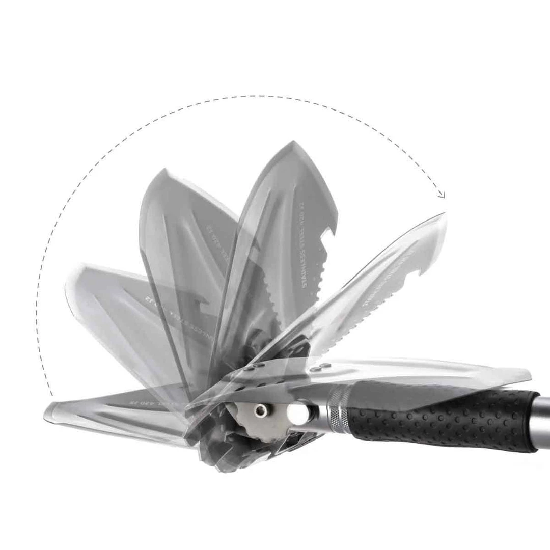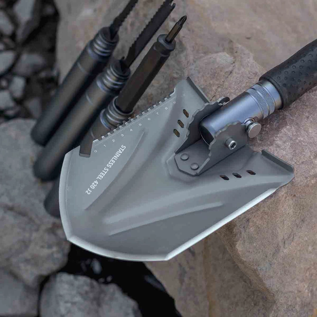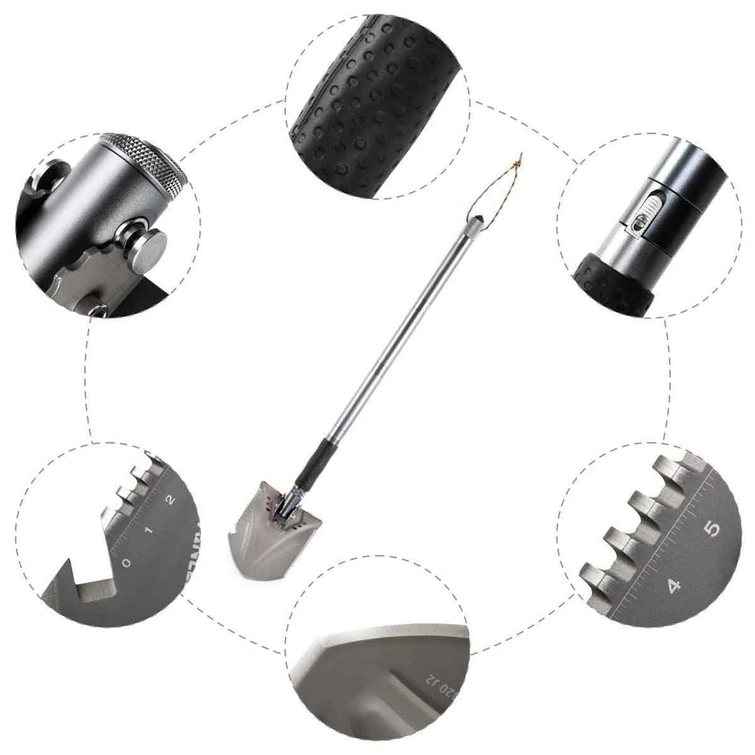 - MULTIFUNCTIONAL: This foldable shovel is a multifunctional tool designed for outdoor adventure lovers. It combines a shovel, saw, knife, tinderbox, screwdriver, fish scaler, cover, and carrying bag. The shovel is reliable and contains a variety of tools that help to survive in any situation.