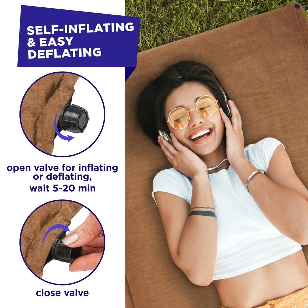 - QUICK SET UP – There is no need to carry a pump and waste your energy on inflating the mattress: two self-inflating valves provide faster inflating and deflating.