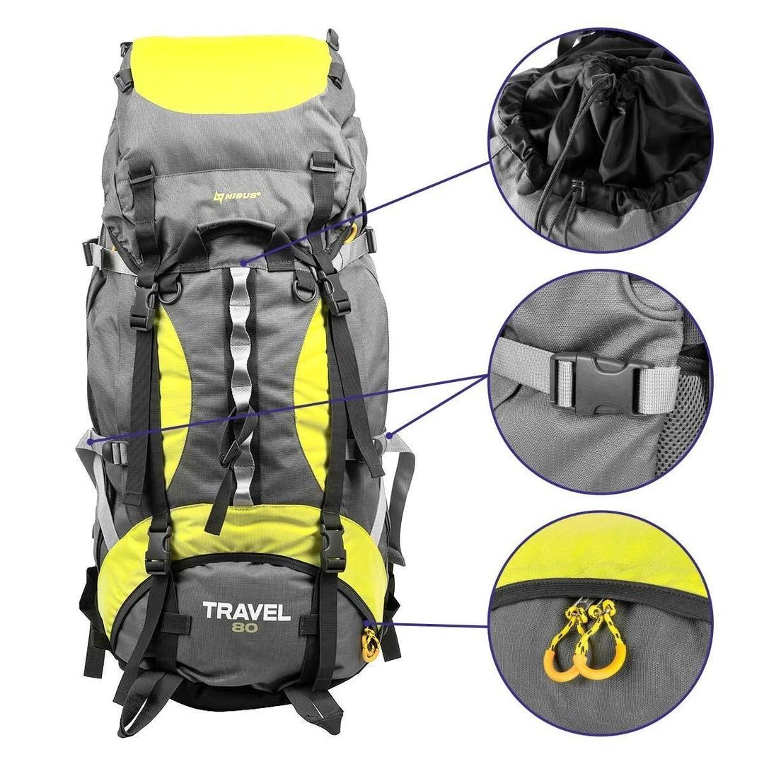 - LARGE CAPACITY: Â The NISUS TRAVEL backpack provides an 80L of space for the traveler, suitable for a multi-day trip. Â It has a spacious main compartment and detachable lid pocket with inner and outer compartments for all the necessary items.