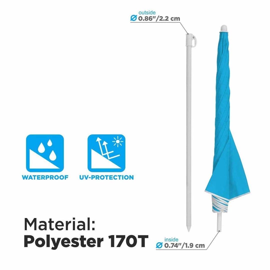 The NISUS small sun umbrella is sturdy due to its steel pole. The pole has a powder coating that makes it rust-resistant and soft to touch. The strong pole can withstand sudden air gusts that would break other beach umbrellas. Use the sand anchor as a base for your umbrella to provide better stability (sold separately). It is reinforced with eight fiber ribs, which makes it more durable and stronger.