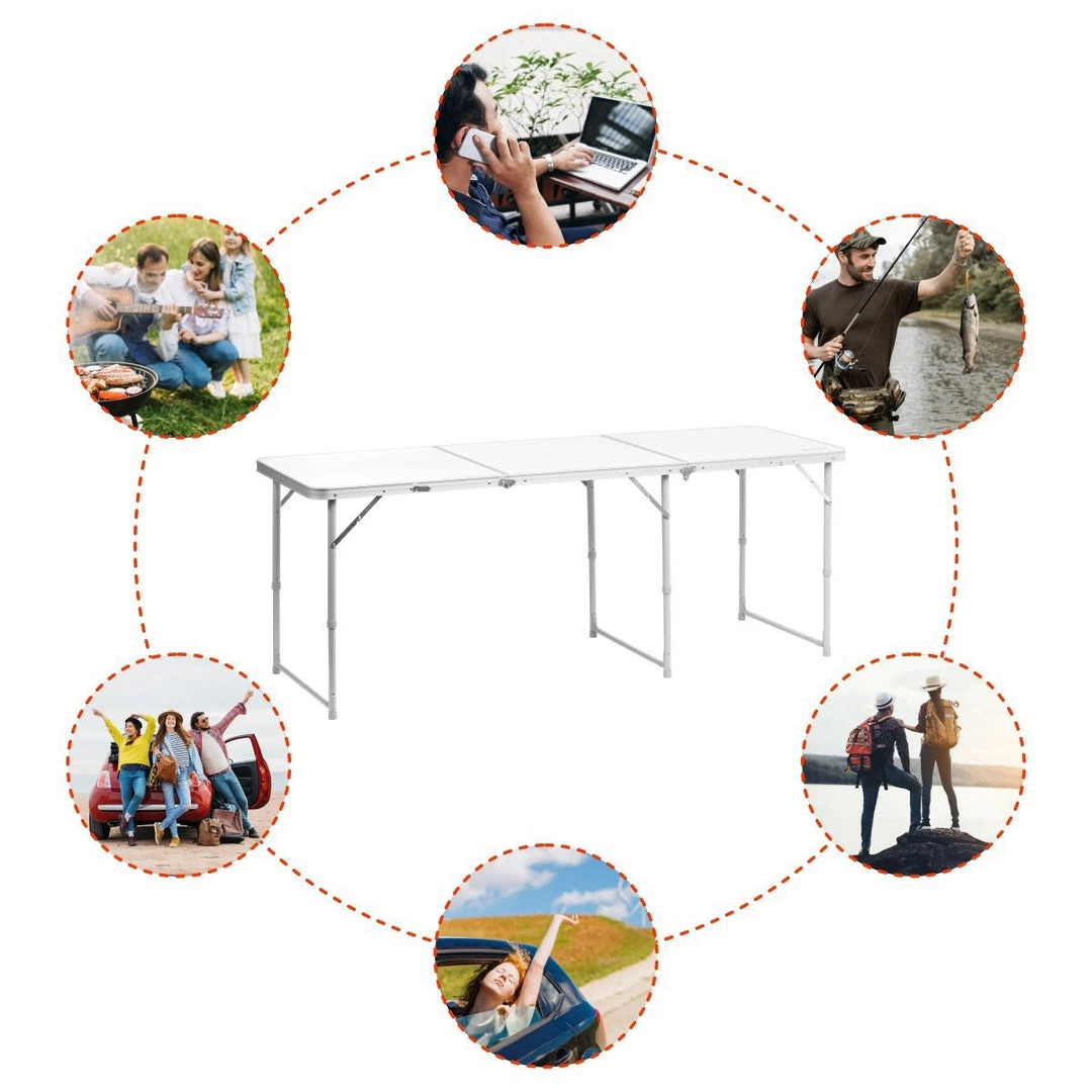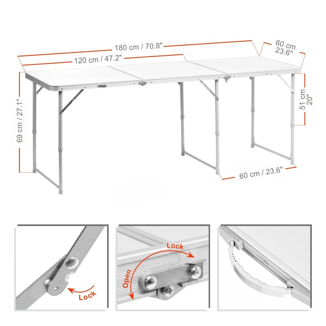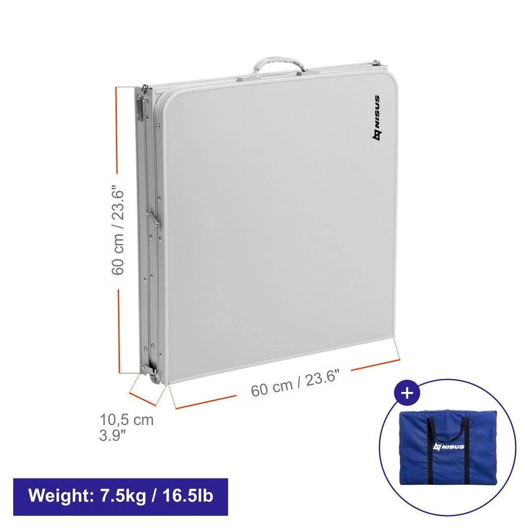 NISUS large folding outdoor camping table is the perfect addition to your camping gear or your RV garage. Whether camping, backyard BBQ with friends, day at the beach or an RV adventure, this lightweight aluminum folding table is a great choice.