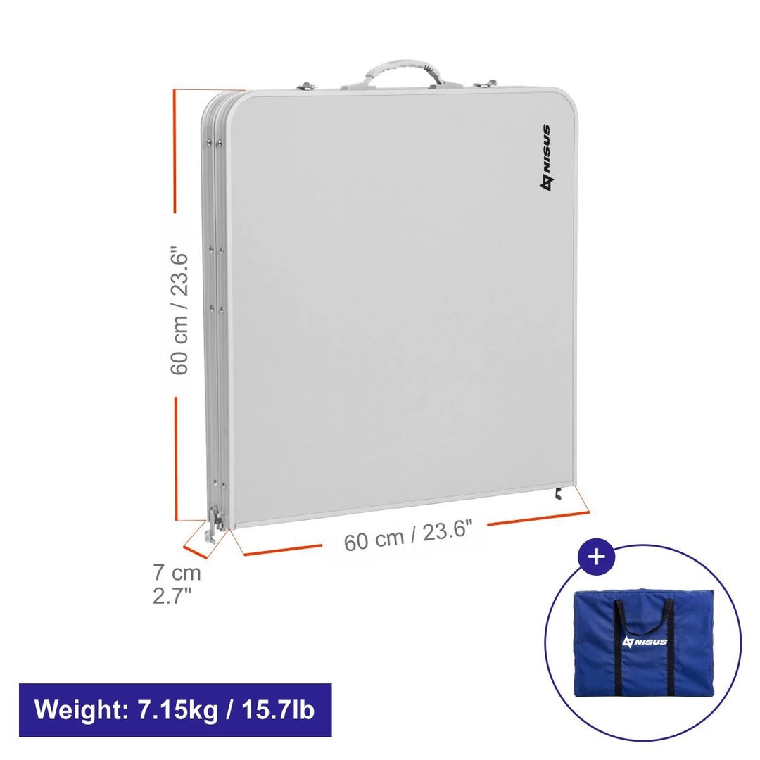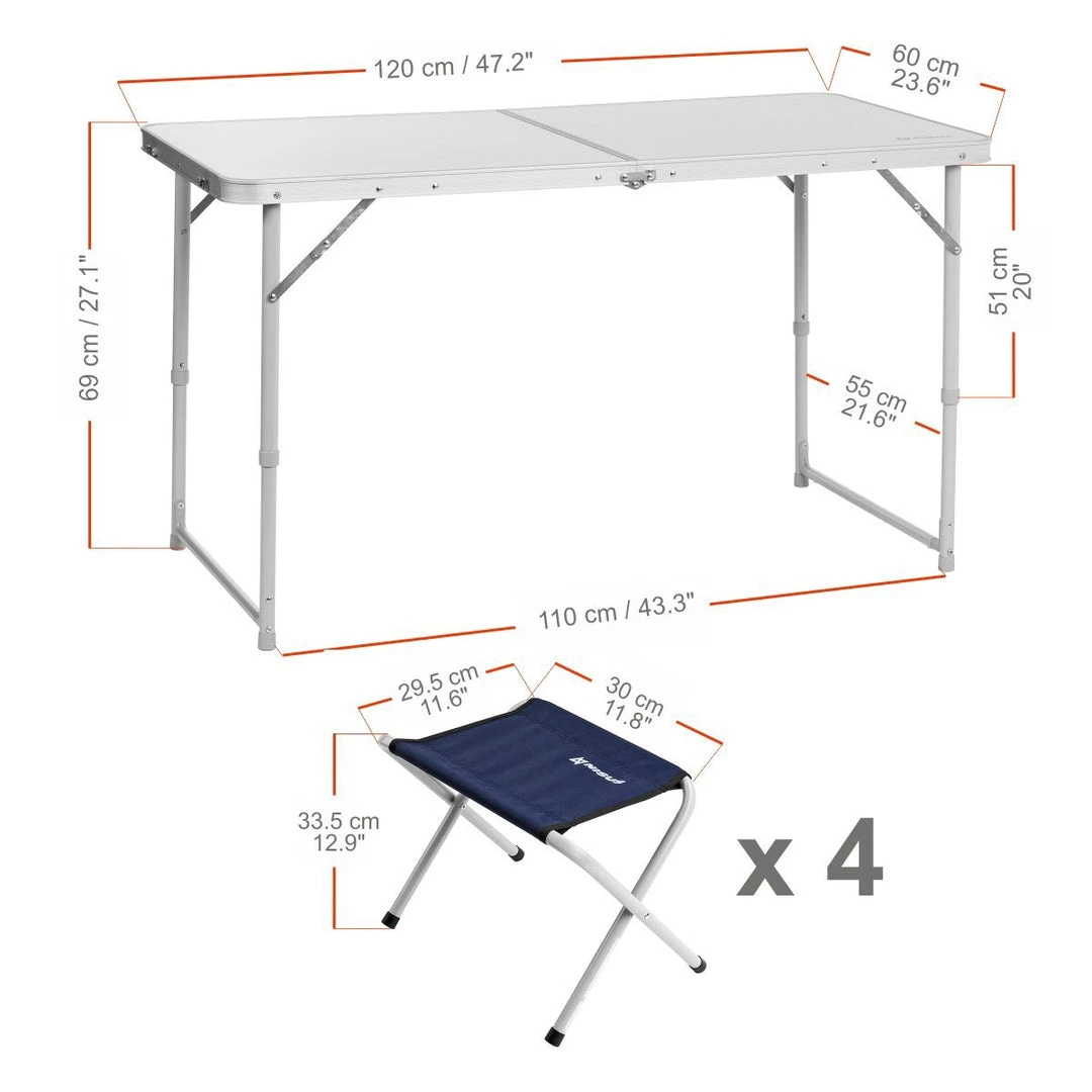 NISUS compact folding outdoor camping table set with four folding camping stools is the perfect addition to your camping gear or your RV garage. Whether camping, backyard BBQ with friends, day at the beach or an RV adventure, this lightweight aluminum folding table is a great choice.