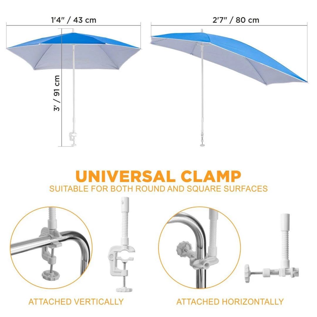 - VERSATILE & MULTIPURPOSE: You can clamp the umbrella onto the round and square surface of patio chairs, beach chairs, strollers, or golf carts. The clamp may be attached either vertically or horizontally. Â