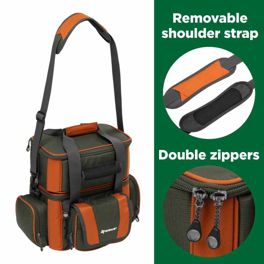 NISUS tackle bag is an excellent choice for fishing lovers! Its thought-out use of space, the roomy main compartments, and large external pockets arrange well-ordered storage. The top smaller bag with removable walls suits perfectly for the fishing reels, and the plastic boxes with flexible compartments are a practical solution to store bites, sinkers, and other small tackle. This soft-sided tackle bag from NISUS will certainly make your fishing experience more organized and comfortable. Â Â
