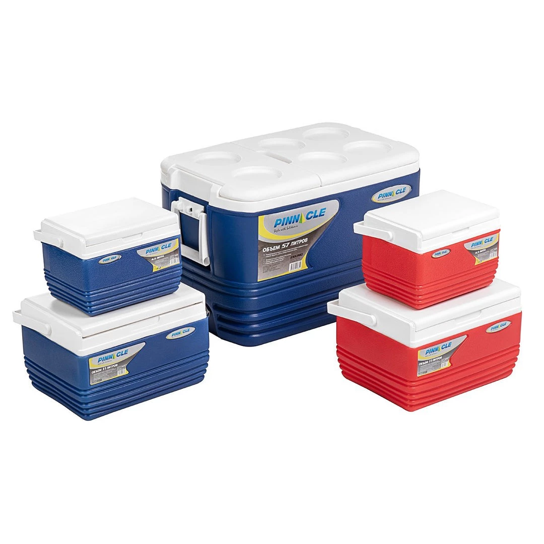 This set of portable outdoor coolers is a must when you go camping, fishing, or traveling on a hot summer day. This set includes five camping coolers of different sizes to store your food, fruits, vegetables, and bottles. The 60.23 qt ice chest can hold up to 75 cans. Each ice cooler has handles. This set is perfect for large companies who love spending time and having fun together in summer. You can keep these ice chests outdoor or in the car. Take them to the beach or when you travel by car and do not spend money on food or cold drinks. The coolers are roomy and provide an efficient use of interior space.Â